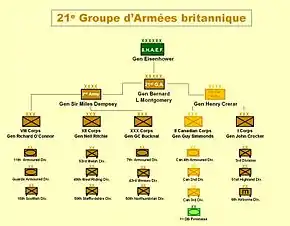 Depuis la réorganisation d'août, le 21e groupe d'armées du général Montgomery est organisé en deux armées distinctes : la 2e armée britannique du général Miles Dempsey et la 1re armée canadienne du général Harry Crerar. L'armée britannique est forte de trois corps d'armée à trois divisions chacune. L'armée canadienne est constituée de deux corps d'armée. Ces forces totalisent 16 divisions, dont cinq blindées, soit 240 000 hommes et 1 500 blindés[18]. Ce début du mois d'août voit l'engagement de la 1re division blindée polonaise du général Maczek, débarquée récemment, le .