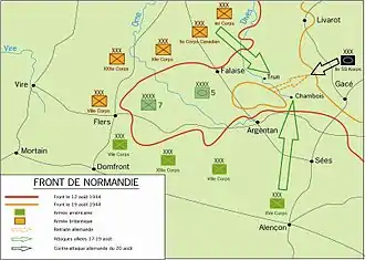 Le , le XVe corps d'armée américain lance son offensive vers le nord afin de contribuer à la fermeture de la poche. Il suit en cela les ordres de Patton, qui avait exigé que ses troupes atteignent la ligne Sées-Carrouges dès que possible[37]. Les 5e DB et 79e DI américaines occupent Sées alors que la 2e DB française du général Leclerc, appuyée de la 90e DI américaine, s'empare d'Alençon le 11 au soir et d’Écouché le 12.