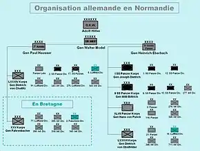 - Panzer Lehr, 5e division de parachutistes, 17e Grenadiers blindés SS, 77e, 91e, 243e, 275e et 352e DI. Source : Paul Hausser, MS-B#179.