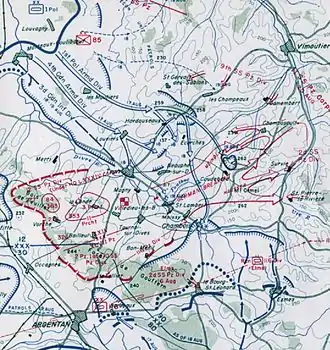 Le , le général Montgomery appelle le général Bradley pour lui proposer que les Canadiens et les Américains se rencontrent sur une zone entre Trun et Chambois[60]. Immédiatement, Patton donne l'ordre aux 80e et 90e divisions d'attaquer respectivement vers Argentan et le Bourg-Saint-Léonard en direction de Chambois afin de couper la route de Falaise à Gacé. Cependant, la résistance acharnée des débris de la 116e division blindée allemande met en échec l'action de la 90e division américaine, ce qui permet aux Allemands d'évacuer plusieurs unités tout au long de la nuit du 16 au .
