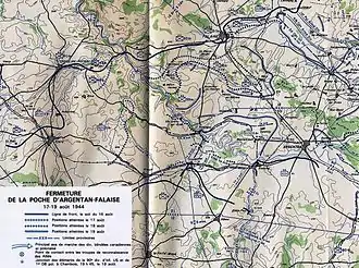 Vissé sur les directives de l'opération Overlord, le commandement allié suit le plan Cossac de 1943 qui prévoit une progression relativement lente mais systématique vers l'Allemagne[57]. Une frontière imaginaire existe entre les Américains et les Anglais, laquelle ne doit pas varier, même devant les événements favorables de début . Le général Bradley décide, de ce fait, de ne pas effectuer d'effort important au-delà d'Argentan, afin de pousser rapidement vers la Seine[58]. Dans l'esprit du stratège américain, il revient à la 1re armée canadienne de fermer la poche, d'autant que, pense-t-il, « la majorité des forces de la 7e armée allemande avait dû s'échapper ». Aussi, une partie du XVe corps américain[59] est-elle dirigée vers Dreux dès le . La 2e division blindée française et la 90e division d'infanterie sont laissées face à Argentan en flammes, toujours occupée par la 116e division blindée du groupement Eberbach.