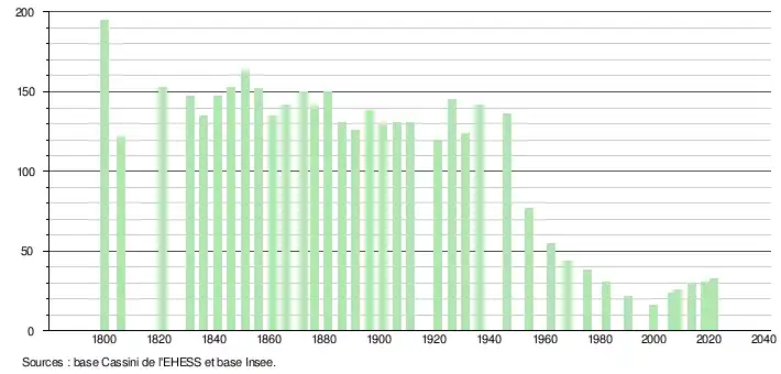 L'évolution du nombre d'habitants est connue à travers les recensements de la population effectués dans la commune depuis 1800. Pour les communes de moins de 10 000 habitants, une enquête de recensement portant sur toute la population est réalisée tous les cinq ans, les populations légales des années intermédiaires étant quant à elles estimées par interpolation ou extrapolation[18]. Pour la commune, le premier recensement exhaustif entrant dans le cadre du nouveau dispositif a été réalisé en 2008[19].