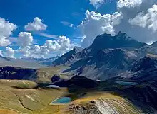 Vue depuis la pointe de Lanserlia à l'ouest de la pointe des Broès, de la pointe du Vallonnet et du Grand roc Noir (de gauche à droite) par-delà le col de Lanserlia et ses trois lacs en .