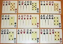 | Bas | 10♠ 9♣ 8♥ 7♠ 6♣ | R♠ R♥ 6♦ 6♠ 3♦ | 9♥ 9♦ 9♠ 2♣ 2♦ | 10♥ 10♦ 10♣ 2♠ 2♥ |