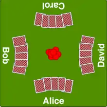 Si le donneur est un joueur, chacun tire une carte avant le début de la partie. Celui qui tire la carte la plus haute distribue le premier ; les autres joueurs distribueront ensuite tour à tour.