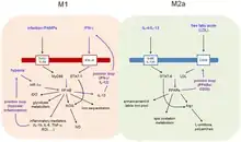 Le concept de polarisation des macrophages a été défini pour la première fois en 1992 avec la découverte que l'interleukine 4 inhibe la production de dérivés réactifs de l'oxygène par les macrophages tout en améliorant l'expression du complexe majeur d'histocompatibilité II et des récepteurs du mannose (CD206) à la surface de leurs cellules[1]. Depuis lors, deux phénotypes opposés et concurrents, souvent appelés macrophages classiquement activés (macrophages M1) et macrophages alternativement activés (macrophages M2) ont été définis et identifiés dans plusieurs contextes physiologiques[2],[3],[4].