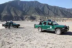 Devant la géographie du pays, les principales automobiles utilisés par les policiers afghans sont des 4x4 : Ford Ranger/Ranger SORV (États-Unis), Nissan Frontier (Japon) et Toyota Hilux (Japon) que complètent un parc de Volkswagen Transporter T4/Eurovan (Allemagne) et de UAZ-469 (URSS/Russie). Des Humvee (États-Unis) et des motos Yamaha (Japon) sont aussi en service. Certains véhicules sont armées de mitrailleuses.