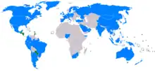 - Amériques : Antigua-et-Barbuda, Bahamas, Barbade, Bolivie, Costa Rica, Cuba, Dominique, République dominicaine, Grenade, Guyana, Jamaïque, Nicaragua, Panama, Salvador, Suriname, Trinité-et-Tobago, Uruguay, Venezuela