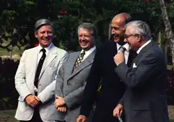 Entre ces deux guerres coloniales, la crise de Suez met en évidence la faiblesse de la France, ainsi que celle du Royaume-Uni. Les deux pays s'entendent en 1956 pour reprendre le contrôle du canal de Suez que Nasser a nationalisé. Malgré la demande des États-Unis que la question soit réglée par la voie diplomatique, les Français et les Britanniques préparent dans le plus grand secret leur opération militaire conjointe avec Israël contre l’Égypte pour reprendre le contrôle du canal de Suez et surtout maintenir la présence occidentale dans la région. Les opérations militaires entreprises début ouvrent une crise majeure obligeant les deux pays européens à stopper leurs opérations sous la pression de l'Union soviétique mais surtout celle des États-Unis ou le président Eisenhower n'accepte pas d'avoir été trompé par ses deux alliés les plus proches[43]. La situation au Maghreb et l'affaire de Suez empêchent la France de mener une politique arabe positive et créent un contexte favorable au développement des relations entre la France et Israël. Celles-ci connaissent leur âge d'or entre 1954 et 1959, concrétisé par la fourniture d'armements français et surtout d'une aide essentielle au programme nucléaire israélien[44],[45],[alpha 5].