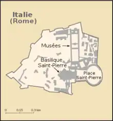 - La Cité du Vatican, avec ses quarante-quatre hectares, est le plus petit État du monde. Il remplit les fonctions de support matériel des activités du Saint-Siège et de conservation de son patrimoine religieux, artistique et culturel. Le pape en est le souverain de droit absolu et divin, concentrant entre ses mains les trois pouvoirs législatif, exécutif et judiciaire. Selon les mots mêmes de Jean-Paul II, cet État existe comme garantie de l'exercice de la liberté spirituelle du Siège apostolique (autre nom du Saint-Siège), et donc comme moyen d'en assurer l'indépendance réelle et visible dans son activité de gouvernement en faveur de l'Église universelle. Plus prosaïquement, Pie XI le définissait comme « un lopin de terre bien utile au Saint-Siège »[2].