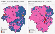 Couleur politique des communes limousines peuplées de plus de 3 500 habitants en 2014, après les élections municipales françaises de 2001, de 2008 et de 2014 :