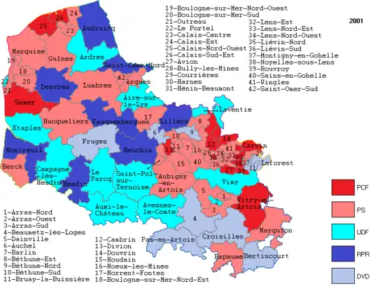 - 2e circonscription : cantons d'Arras-1 (sauf commune de Beaumetz-lès-Loges), Arras-2 (sauf commune de Monchy-le-Preux), Arras-3 (6 communes), Brebières (6 communes), Bully-les-Mines (4 communes) et Liévin (communes de Givenchy-en-Gohelle et Vimy), communes d'Acheville, Bois-Bernard et Duisans.