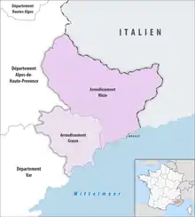 La préfecture des Alpes-Maritimes est localisée à Nice. Le département possède en outre une sous-préfecture à Grasse. Jusqu'en 1926, un arrondissement supplémentaire était situé à Puget-Théniers.