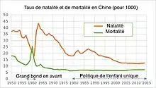 Malgré l’assouplissement de la politique de l’enfant unique (dans les années 1980, puis en 2013, 2016 et 2021), le taux de natalité reste en dessous du seuil de renouvellement de la population. Le vieillissement de la population chinoise est aussi une des conséquences de cette politique[43]. Il se traduit par une baisse de la part de la population en âge de travailler (15–59 ans) dans la population totale, passée de 70 % en 2011 à 65 % en 2018[44],[45],[46],[47].