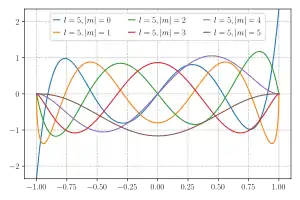 laquelle n'a de solution régulière que sur l'intervalle [–1, 1] et si –ℓ ≤ m ≤ ℓ avec ℓ et m entiers. Elle se réduit à l'équation différentielle de Legendre si m = 0.