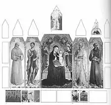 À l'origine les vingt-trois panneaux du polyptyque étaient entourés d'un cadre doré, couronné de pinacles et attaché à l'autel de l'église. Les saints les plus vénérés par la confrérie sont peints sur les panneaux latéraux :