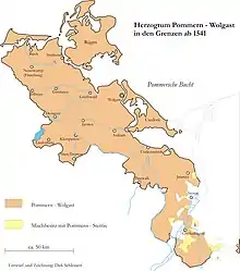 De 1478 à 1523, les deux duchés partiels de Poméranie de Wolgast et Stettin sont réunis sous Bogislaw X. En 1532, son fils Barnim IX de Poméranie et le neveu de ce dernier Philippe Ier de Poméranie se partagent à nouveau la Poméranie. Philippe a obtenu le duché partiel avec résidence à Wolgast, qui, contrairement aux divisions précédentes, comprenait cette fois toute la Poméranie antérieure à gauche de la Swine et de l'Oder (voir la carte au début de l'article) et également de petites zones à l'est de l'Oder, à la frontière sud avec le Brandebourg, faisant partie de cette nouvelle Poméranie-Wolgast. En 1534, à la Diète de Treptow-sur-Rega, les états poméraniens adoptèrent la Réforme luthérienne comme proposée par Johannes Bugenhagen pour tout le duché. Lorsque les ducs de Poméranie-Wolgast s'éteignirent en 1625, tout le duché fut réuni sous un seul régent.