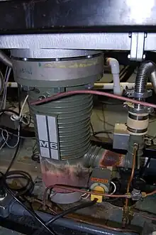 Une pompe à diffusion est une pompe de transfert cinétique à fluide moteur. Elle se compose d'un corps de pompe refroidi par une circulation d'eau à l'intérieur duquel sont placés des cônes formant des tuyères à leur partie supérieure. Le fluide moteur (généralement une huile de silicone) est situé dans la partie inférieure de l'appareil. Une résistance chauffante permet de vaporiser le fluide. La vapeur monte axialement et sort dans la partie supérieure des cônes sous forme de jets supersoniques dirigés vers le bas et dans lequel diffusent les gaz de l'enceinte à vide. En arrivant au contact des parois refroidies, les jets formés des gaz pompés et de la vapeur d'huile sont fractionnés : l'huile se condense et retombe dans la chaudière, alors que les gaz se trouvent à la partie inférieure de la pompe au niveau d'un ajutage où ils sont repris par une pompe primaire (pompe à palettes qui les refoule à l'extérieur).
