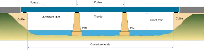 - l'ouverture totale est la distance entre murs droits (piédroits) des culées ;