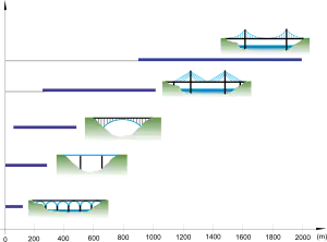 Le graphique ci-contre présente les plages de portées pour lesquelles chacun des types de ponts présentés ci-dessus est le plus adapté. Il s'agit d'optima financiers, qui peuvent être remis en cause pour des raisons esthétiques ou techniques.