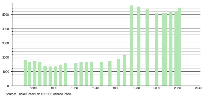 L'évolution du nombre d'habitants est connue à travers les recensements de la population effectués dans la commune depuis 1872. Pour les communes de moins de 10 000 habitants, une enquête de recensement portant sur toute la population est réalisée tous les cinq ans, les populations légales des années intermédiaires étant quant à elles estimées par interpolation ou extrapolation[29]. Pour la commune, le premier recensement exhaustif entrant dans le cadre du nouveau dispositif a été réalisé en 2008[30].