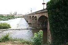 La vue à l'entrée du pont en arrivant depuis l'ouest, côté rive gauche, offre un alignement particulièrement remarquable de quatre flèches issues des deux principaux édifices religieux de la ville :