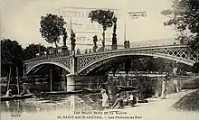 Le premier pont inauguré en 1841 est un pont suspendu d'une seule travée de fiabilité incertaine. Afin de financer cet ouvrage, un péage est mis en place jusqu'en 1870. À cette date, le pont est détruit pendant la guerre franco-prussienne. Un second pont est édifié entre 1872 et 1874 sur les plans de l'architecte Joret.