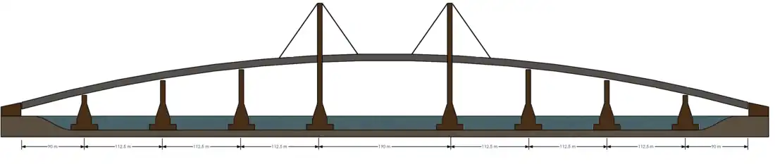 Un pont temporaire a été construit sur chaque rive afin de faciliter la construction des huit piliers du pont. En , les quatre piliers près de la rive sud ont été installés[4].