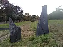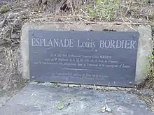 ![]() Stèle, Pont de Prunier, rive gauche de la Maine | ![]() Plaque de l'Esplanade Louis Bordier, rive droite du Pont de Pruniers | ![]() A gauche, la stèle en hommage à la Résistance française, à droite la stèle en hommage aux troupes américaines "Red Diamond" |