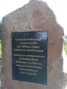 Le 8 août 1992, en présence d'une vingtaine de vétérans américains, dont Herb Williams qui commandait la compagnie L, de Lewis Dilwith, qui commandait la section d'infanterie qui a pris et traversé en premier le pont de Pruniers, du Brig Gen (Ret) William Birdsong (alors Major), qui commandait le 3e bataillon du 11e régiment, une stèle a été inaugurée sur la rive gauche, à l'extrémité du pont de Pruniers, en hommage aux officiers, sous-officiers, et soldats américains qui ont libéré Angers en août 1944. Cette stèle a été érigée à l'initiative de Guy Stéfanini et l'inscription est de Yves J. Bellanger et Guy Stéfanini [2]. Le deux autres stèles ont été levées sur la rive droite (esplanade Louis Bordier) en hommage aux soldats du général Patton et à la Résistance Française, à l'initiative de la mairie de Bouchemaine.