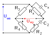 Le pont de Wien permet, lui, de mesurer avec précision la capacité CX d'un composant et sa résistance RX. Il est constitué de quatre branches, le composant inconnu étant placé sur l'une d'elles, les autres branches comprenant chacune une résistance (R2, R3, R4) connue, R2 étant en série avec un condensateur C2. On applique alors au montage (entre les sommets 1-3 et 2-4) une tension sinusoïdale de pulsation ω.