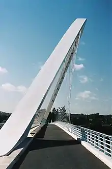 La finesse de l'arc métallique incliné sur le bord du tablier, l'élégance de la suspension en câbles, le dessin original de ses appuis en Loire supportant le tablier, et le rôle majeur joué par la torsion dans le fonctionnement général de la structure sont les principaux éléments qui caractérisent cet ouvrage.
