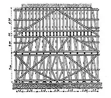 Il y a trois étages de pièces équarries : l’étage supérieur a vingt-et-une fermes reposant sur une ligne de coins qui servent à régler la hauteur des fermes, puis à décintrer. Les deux autres étages n’ont que onze fermes. Les palées de l’étage inférieur reposent sur des plateformes en maçonnerie de ciment de 20 m de longueur En trois mois, on a approvisionné le bois et construit le cintre avec 40 charpentiers, puis il a été monté en 14 semaines[S 2].
