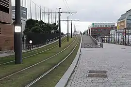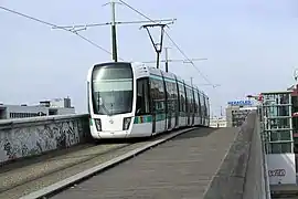Une rame de tramway de la ligne T3b franchit le pont du canal de l'Ourcq devant les Grands Moulins de Pantin. | |||||