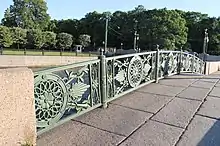 L'ancien pont en bois a été construit entre 1720 et 1730 [1],[2],[4]. Il comprenait un système de poutres avec des supports sur une fondation sur pieux [5]. Il s'appelait le premier pont de Tsaritsyne car près du pré Tsaritsyne, maintenant le Champ de Mars[a]. Il a été remplacé par un pont fixe en bois dans les années 1760. Les ingénieurs Pierre-Dominique Bazaine, Andreï Gotman et A.I. Remezov étaient responsables de la conception du pont voûté en brique à une travée, avec ses façades et ses piliers revêtus de granit et des balustrades en fonte conçues par Carlo Rossi. Son nom permet de le distinguer du pont traversant l'extrémité nord du canal, qui était une construction en pierre depuis 1768.