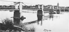 En août 1944[3], l'aviation alliée détruisait un câble suspenseur amont de la troisième travée rive droite. Les suspentes se trouvant libres en tête, tout l'ensemble du tablier bascula en pivotant autour de la suspension aval. Durant toute l'exécution des travaux de remise en état par l'entreprise Baudin, jusqu'au , un ouvrage provisoire en charpente permettait le passage des piétons et des véhicules légers.