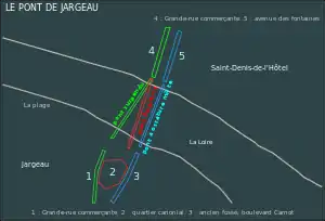A contrario, sur la rive gauche à Jargeau, le pont de pierre et le pont suspendu n'eurent pas la même issue sur la ville. En effet, il semble qu'au XIIIe siècle, le tracé du pont privilégia la collégiale et son quartier canonial à la Grande-Rue commerçante. Le pont de pierre arrivait alors au niveau de l'actuelle « rue de l'ancien pont », dans l'axe du quartier canonial. Au XIXe siècle en revanche, le tracé du pont privilégia le centre de vie de la population, dans l'axe de la Grande-rue commerçante, à l'image de ce qui existait à Saint-Denis-de-l'Hôtel.