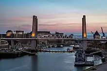 Le pont de Recouvrance, construit après-guerre pour remplacer le pont National est un pont levant qui permet la navigation des bâtiments militaires sur la Penfeld. Ses deux hauts piliers de béton sont devenus une image emblématique de Brest[9].