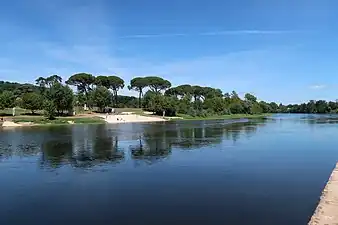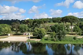 La Dordogne longe la commune sur son flanc sud-est. D'une longueur totale de 483,1 km, elle prend naissance sur les flancs du puy de Sancy (1 885 m), dans la chaîne des monts Dore, traverse six départements, dont la Dordogne dans sa partie sud, et conflue avec la Garonne, pour former l'estuaire de la Gironde[17]. Elle borde la commune au sud sur plus de sept kilomètres, face à Saint-Avit-Saint-Nazaire, Pineuilh, Sainte-Foy-la-Grande et Eynesse.