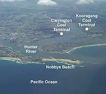 Newcastle se trouve sur la côte orientale de l'Australie, à l'embouchure de la Hunter dans l'océan Pacifique. La production des 35 mines de charbon à ciel ouvert de toute la vallée de l'Hunter arrive au port par voie de chemin de fer (Hunter Valley Coal Chain (en))[6].
