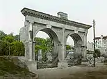 La double porte, comme son nom l'indique, se dresse avec trois demi-colonnes corinthiennes entre et de chaque côté des deux arches. Les colonnes supportent un entablement avec sa frise et sa corniche, mais l'architrave manque [6]. La couronne en relief de la corniche relie l'ensemble en un tout harmonieux.