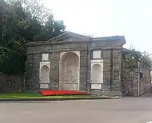 La fontaine devant la porte a été approuvée par les recteurs de la ville Francesco Longo et Marc'Aurelio Memo ; elle a été commencée le et les noms des deux recteurs ont été gravés dans les médaillons debout sur les côtés du monument.