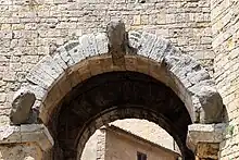 Sur le fronton extérieur, le point remarquable de la porte est constitué par la mise en évidence des trois éléments principaux de l'arc (la clé de voûte et les deux piani di imposta (pieds d'impostation), ceci par le biais de trois têtes sculptées dans la pierre (Protomés) représentant peut-être Giove (Tinia pour les Étrusques) et les deux Dioscures Castor et Pollux ou Uni et Menrva, divinités protectrices, ou peut-être simplement le fruit de la mode orientale préconisant d'exposer sur les murs citadines les têtes coupées des commandants ennemis en dissuation envers toute présence hostile.