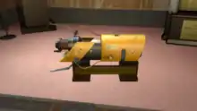 - « Cave Johnson : Prenez cet appareil jaune. Ne vous inquiétez pas, il n'est pas dangereux. Les scientifiques vous ont laissé un... nouvel appareil pour vous aider. Ouais, c'est ça, un nouveau test ! Félicitations ! Vous allez tester autre chose maintenant ! Double ration d'expériences pour vous ! »[6]