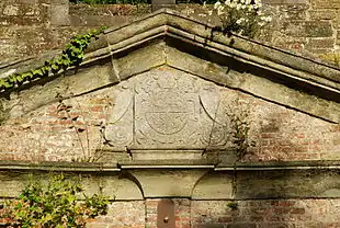La porte est encadrée de deux hauts pilastres dont les chapiteaux plats supportent un large entablement de briques rouges sommé d'un fronton triangulaire à décrochements[6] portant le blason et la devise « Fortiter et Suaviter »[2] (Force et clémence) de l'abbé Jacques Hache[3].