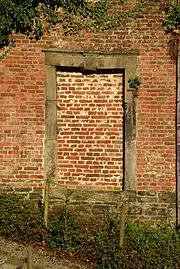 La partie centrale de la façade abrite une haute porte cintrée à encadrement de pierre bleue, impostes et clé d'arc saillante[6] portant le millésime de 1725.