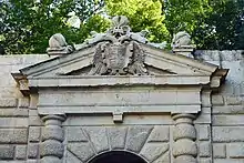 Connue comme porte des Gomérez jusqu'au XVIIIe siècle, elle tient son nom des trois grands fruits de grenades, symbole de la ville, qui couronnent le fronton triangulaire parachevant l'arc principal, et qui accompagnent les armoiries impériales de Charles Quint qui sont sculptées dans le tympan.