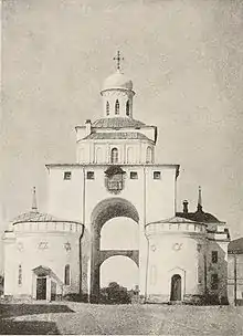 La chronique d'Ipatiev raconte que le prince la rêvait en or, tout en sachant qu'elle serait en fait recouverte de feuilles de cuivre doré qui la feraient étinceler avec éclat au soleil et étonneraient les gens du peuple. Attenants à la porte, au nord et au sud, s'élevaient des remparts contigus entourés de fossés profonds du côté extérieur[2]. Au-dessus du fossé existait un pont permettant l'accès à la ville. La hauteur de l'arc atteint 14 mètres. Les battants de la porte en chêne massif, suspendus par des gonds en fer forgé, surmontés de linteaux à mi-hauteur de l'arc ne subsistent plus aujourd'hui. Au-dessus du linteau il existait un plancher en bois qui servait de plate-forme supplémentaire pour les défenseurs en cas d'attaque, visibles sur les croquis des historiens[3]. Il en subsiste seulement les emplacements des solives dans le maçonnage du mur. L'accès à la plate-forme se faisait par une ancienne baie dans le mur sud, dans l'épaisseur duquel courait un escalier de pierre recouvert d'une voûte. Au même niveau, de l'autre côté de l'escalier existait également une sortie vers les monticules de terre le long des remparts du côté sud. Au nord dans les remparts il existait un passage qui traversant le mur arrivait droit sur la plate-forme[4].