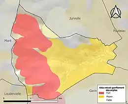 Le retrait-gonflement des sols argileux est susceptible d'engendrer des dommages importants aux bâtiments en cas d’alternance de périodes de sécheresse et de pluie. 85,2 % de la superficie communale est en aléa moyen ou fort (88,8 % au niveau départemental et 48,5 % au niveau national). Sur les 38 bâtiments dénombrés sur la commune en 2019, 38 sont en aléa moyen ou fort, soit 100 %, à comparer aux 98 % au niveau départemental et 54 % au niveau national. Une cartographie de l'exposition du territoire national au retrait gonflement des sols argileux est disponible sur le site du BRGM[29],[Carte 3].