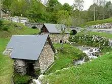 À l'entrée du village, le site des moulins, sur les bords du ruisseau de Labach est un lieu frais, reposant et tranquille. Les deux moulins, à proximité du pont aux cinq arches qui marque l'entrée du village, étaient encore en service au XIXe siècle et sont à peu près bien conservés. Ils sont l'objet de toutes les attentions de la part de la municipalité en place qui envisage la restauration de l'un d'eux. La pachère, sorte de bief alimentant en eau le moulin d'en bas a été refaite. Ce lieu a aussi bénéficié de quelques aménagements au cours des dernières années : installation d'une table de pique-nique, élargissement du virage du pont avec enrochement et plus récemment renforcement par empierrement des berges du ruisseau pour protéger la route des crues du torrent avec aménagement d'un parking destiné aux randonneurs et utilisateurs des gîtes. Le projet d'aménagement de ce site prévoit la réhabilitation du sentier permettant l'accès piétonnier au village, le dégagement et la restauration des murs de pierre, l'entretien des espaces verts et la création d'un nouveau sentier. Ce sentier passera sous une arche du pont, longera le ruisseau et après le franchissement d'une échelle ou escalier, débouchera derrière l'église et rejoindra les différents sentiers de randonnée traversant le village : la Passéjade, le tour d'Oueil-Larboust et le GR 10 menant au col du Lion et passant par la cabane de Conques.